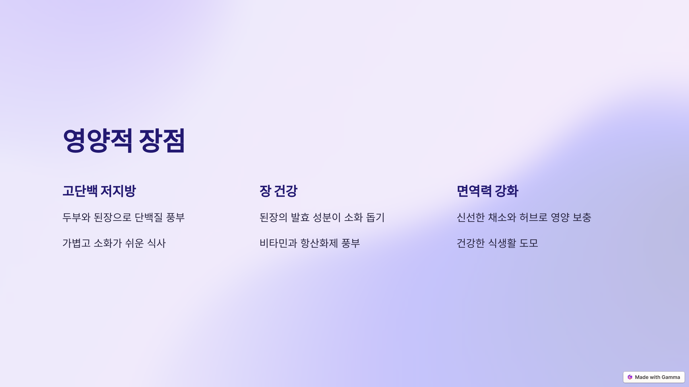 - 단백질 풍부: 두부와 된장은 고단백 식재료입니다.