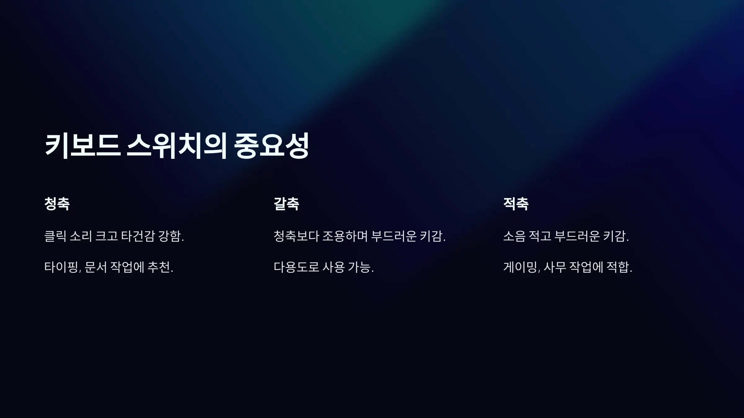 스위치 유형 특징 추천 용도 청축 클릭 소리가 크고 타건감이 강함 타이핑, 문서 작업 갈축 청축보다 조용하며 부드러운 키감 다용도 적축 소음이 적고 부드러운 키감 게이밍, 사무 작업 은축 반응 속도가 매우 빠름 고속 타이핑, FPS 게임