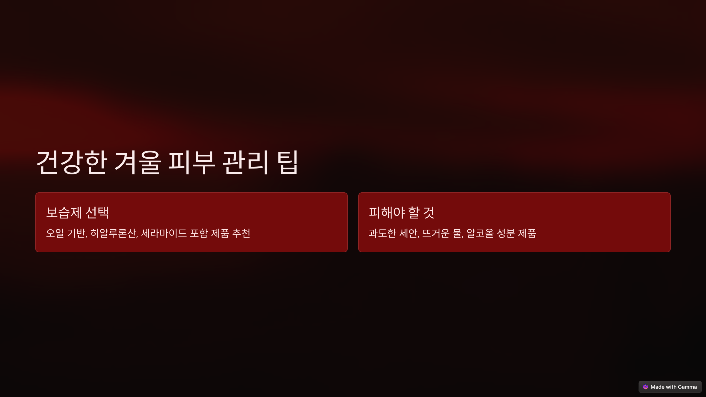 • 고보습 제품 사용: 히알루론산, 세라마이드, 쉐어버터 등이 포함된 제품을 사용하세요. 피부 장벽을 강화하는 크림은 겨울철 필수템입니다.