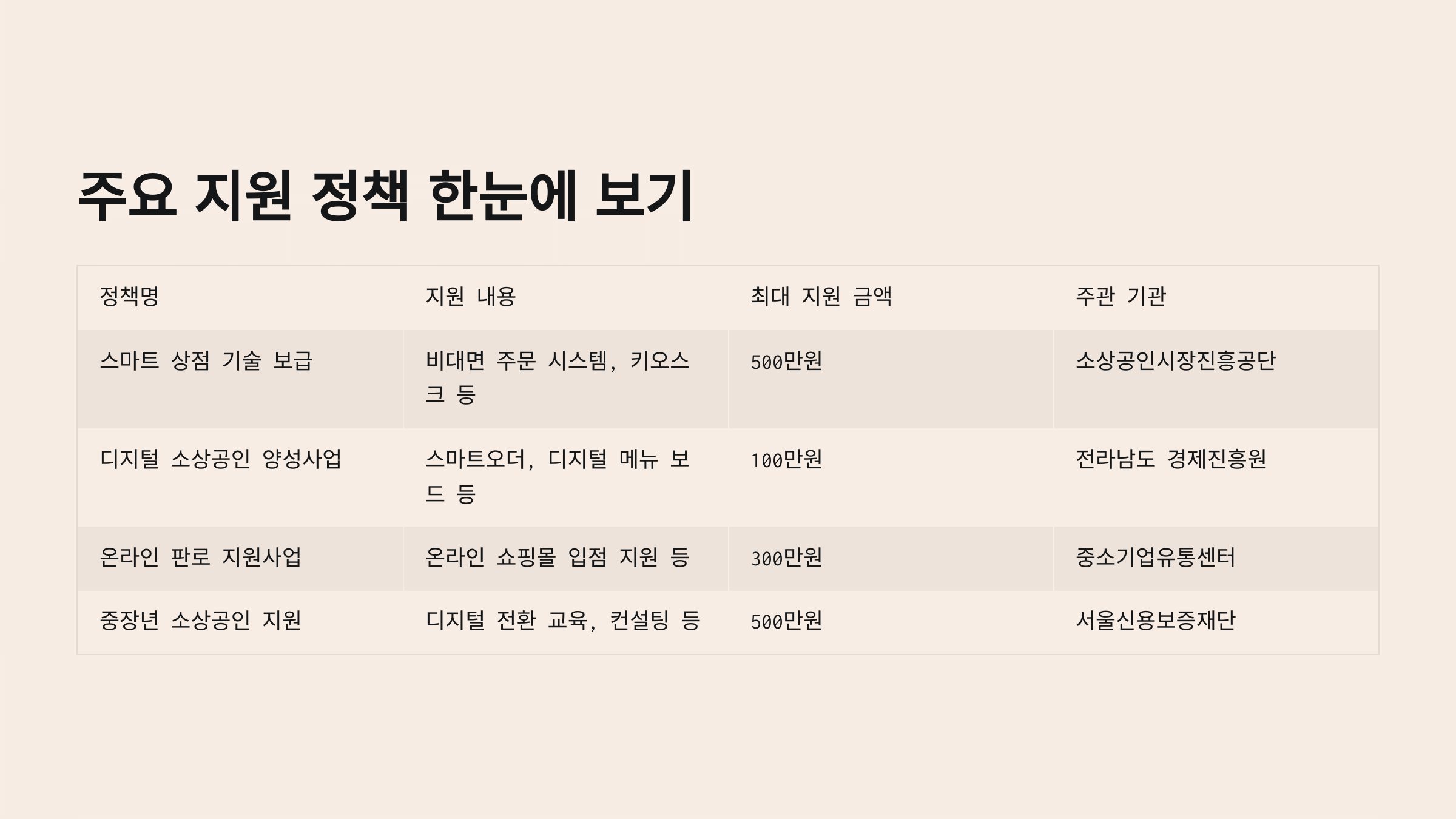 아래 표를 통해 2025년 소상공인 디지털 전환 지원 정책의 주요 내용을 간단히 정리해보았습니다
