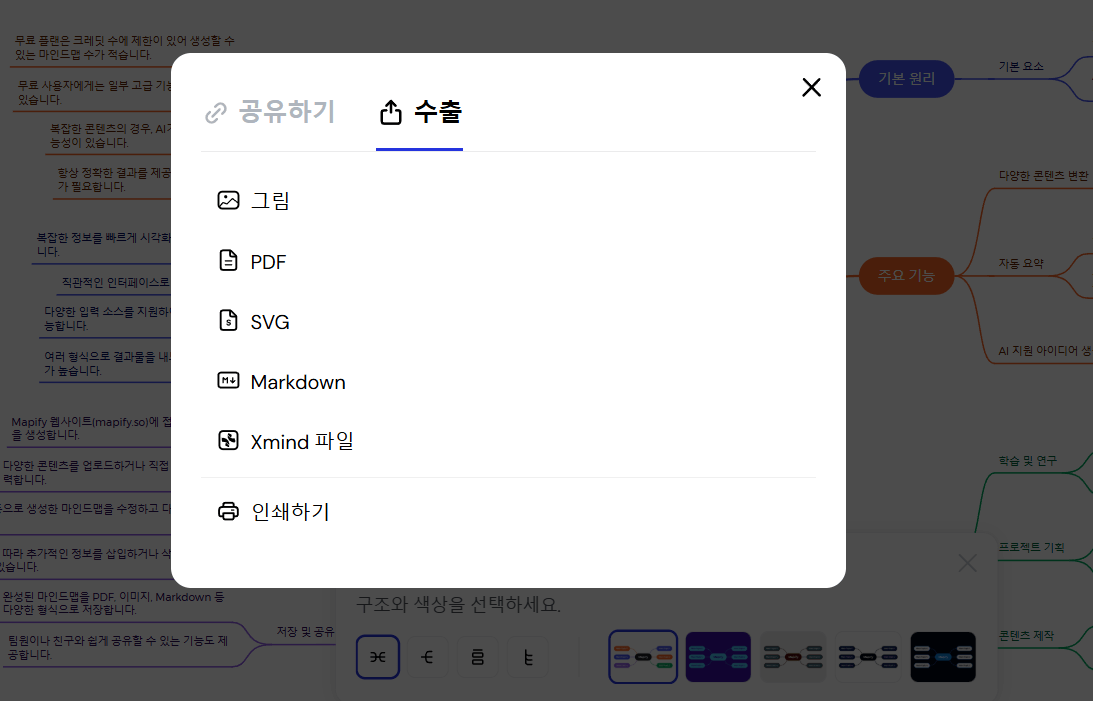 네, 완성된 마인드맵은 PDF, 이미지, Markdown 형식으로 저장하거나 링크로 쉽게 공유할 수 있어요.
