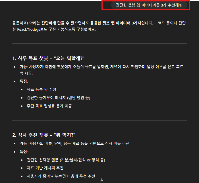 ChatGPT에 이렇게 물어보세요: "간단한 챗봇 앱 아이디어를 3개 추천해줘." 예를 들어, "카페 메뉴 추천 챗봇" 같은 아이디어가 나올 거예요. ChatGPT는 한국어로도 빠르게 답변 주니까, 원하는 주제로 좁혀가며 대화해보세요. 팁: "한국 사용자에게 맞는 챗봇"이라고 조건을 추가하면 더 로컬라이즈된 아이디어가 나와요.