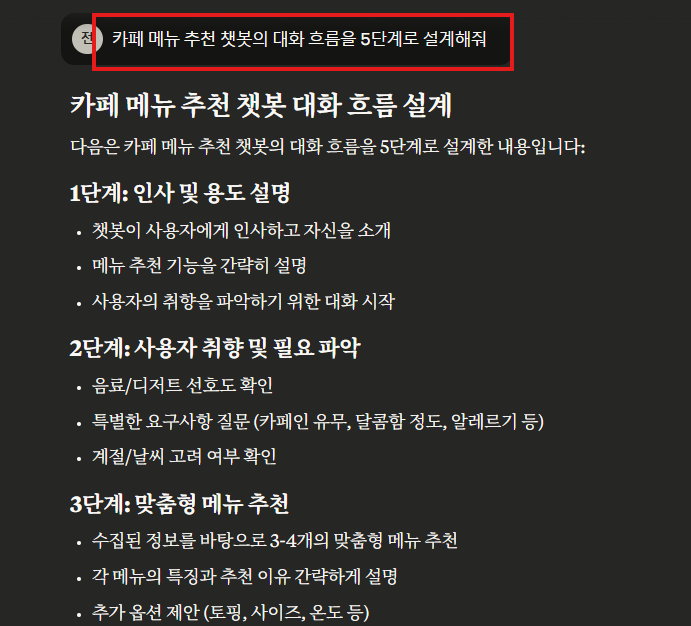 챗봇의 대화 흐름(예: 사용자가 "커피 추천해줘"라고 하면 뭐라고 답할지)을 클로드로 다듬어보세요. 클로드에 "카페 메뉴 추천 챗봇의 대화 흐름을 5단계로 설계해줘"라고 물어보면, 자연스러운 한국어로 단계별 답변을 줘요. 클로드는 특히 한국어 뉘앙스를 잘 살려서, 사용자 경험이 더 부드럽게 느껴지죠.