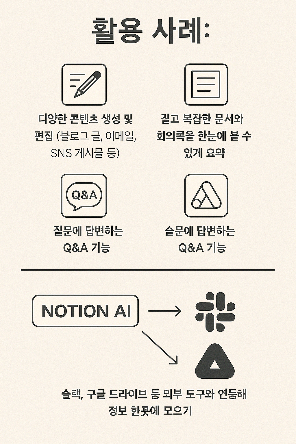 • 콘텐츠 관리: 소규모 마케팅 팀이 Notion AI를 활용해 블로그 초안을 빠르게 작성하고, 콘텐츠 일정을 효율적으로 관리해요.