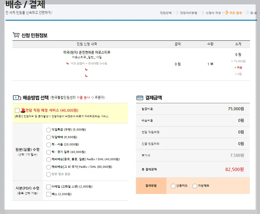 저는 기간에 여유가 있어 일반으로 선택을 했는데요. 장바구니 담기를 하면 원 금액은 75,000원인데 부가세가 붙어 82,500원이라고 나오네요. 민원결제를 클릭을 하면 회원로그인 또는 네이버, 카카오 SNS인증으로 시작할 수 있습니다.